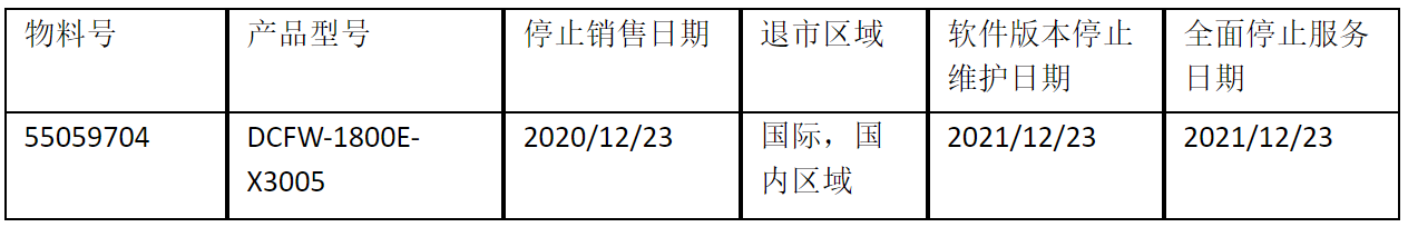 北京维多利亚老品牌VIC数码云科信息技术有限公司正式通知您, 以上DCFW-1800E-X3005下一代防火墙(55059704)将于20201223号停止接收新的订单(具体日期见上表),不再供货。给您带来的不便,敬请原谅。